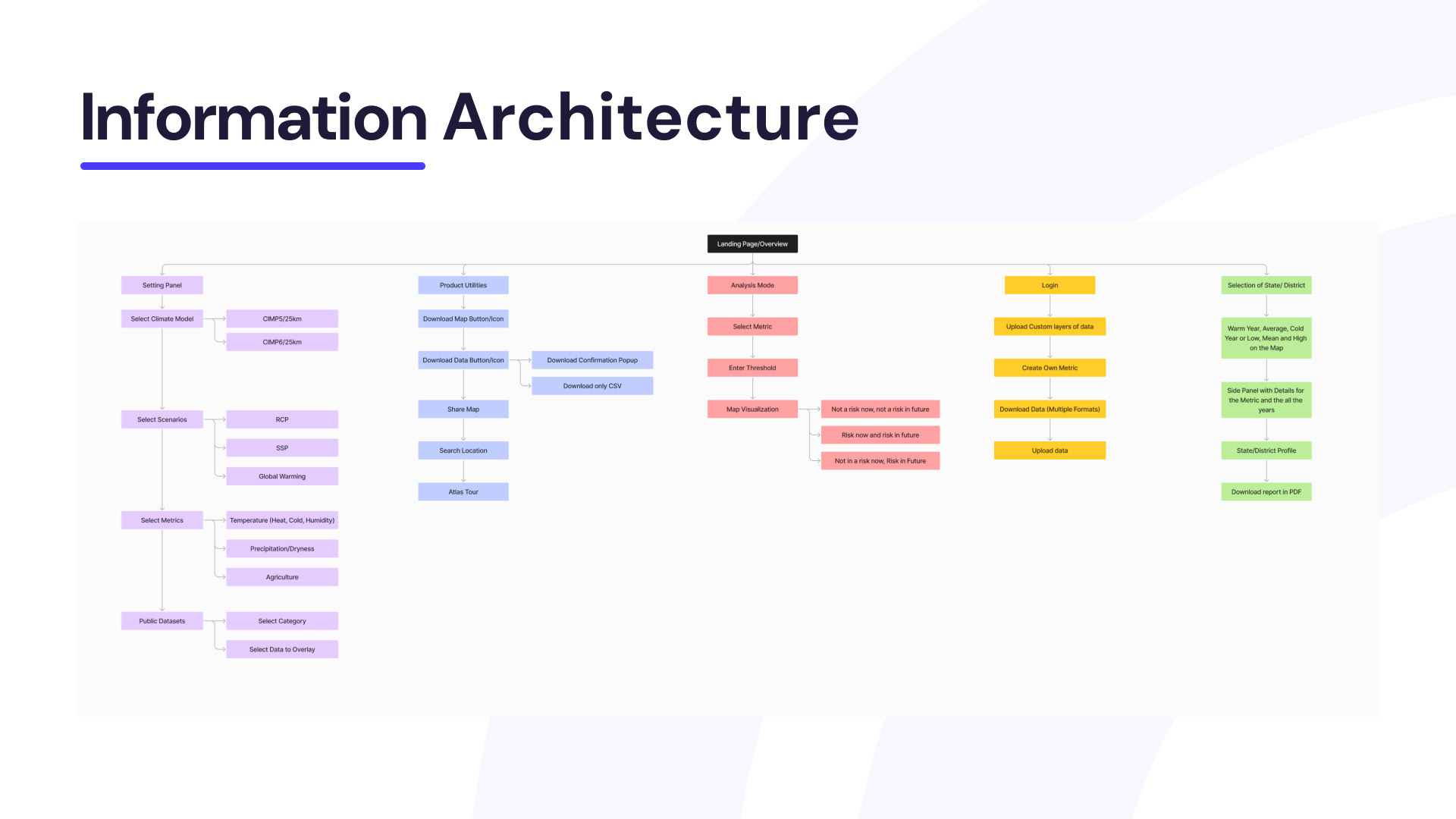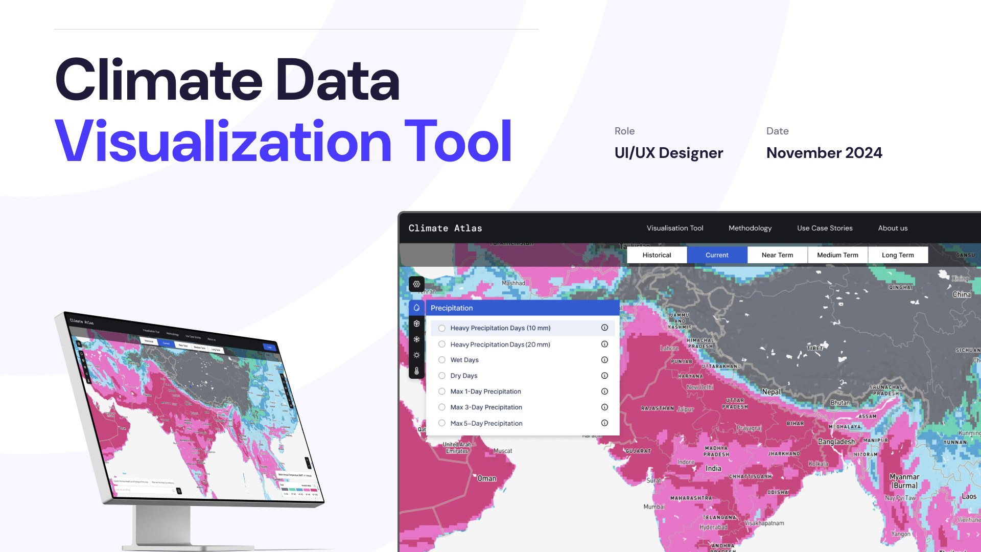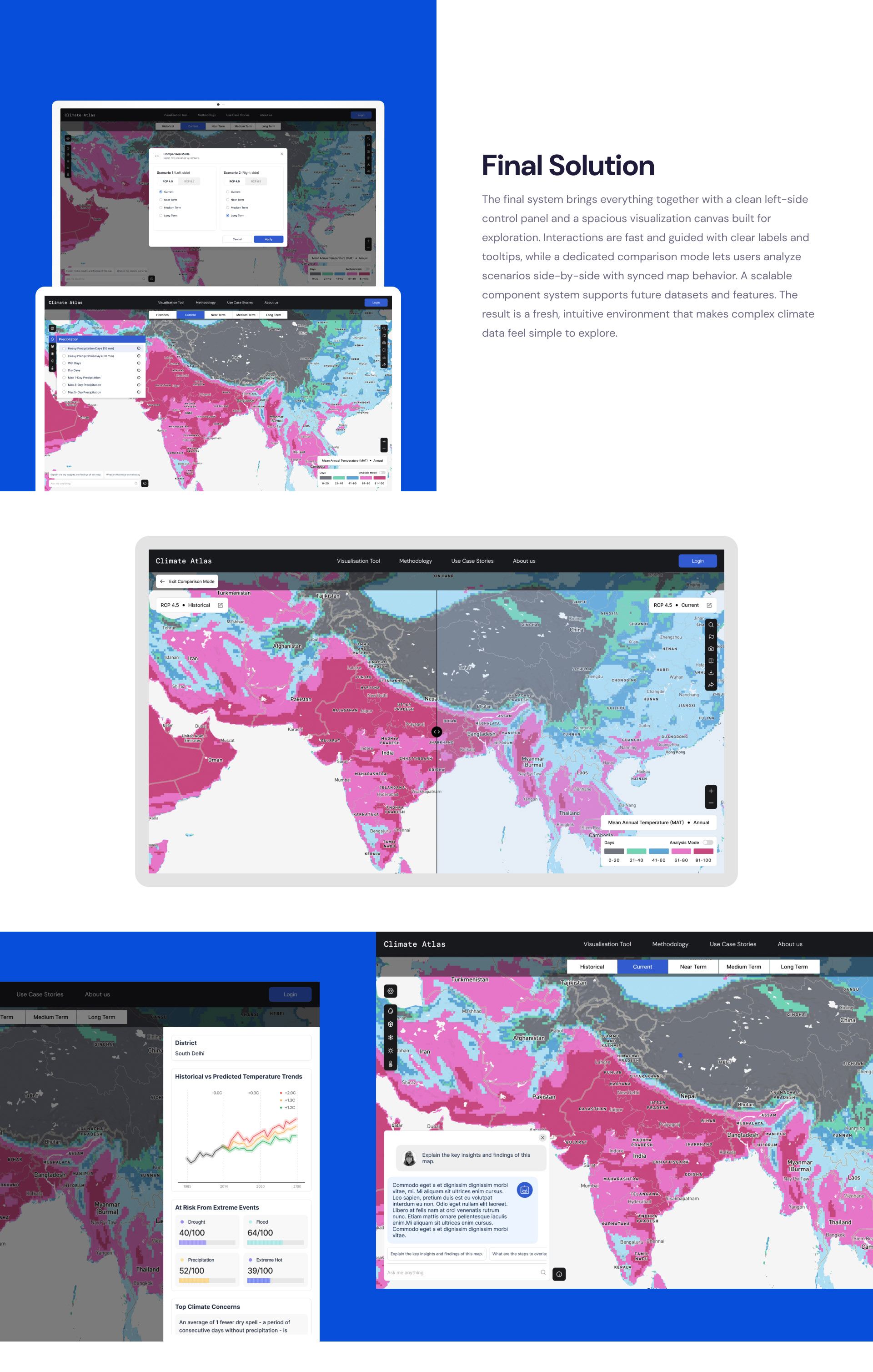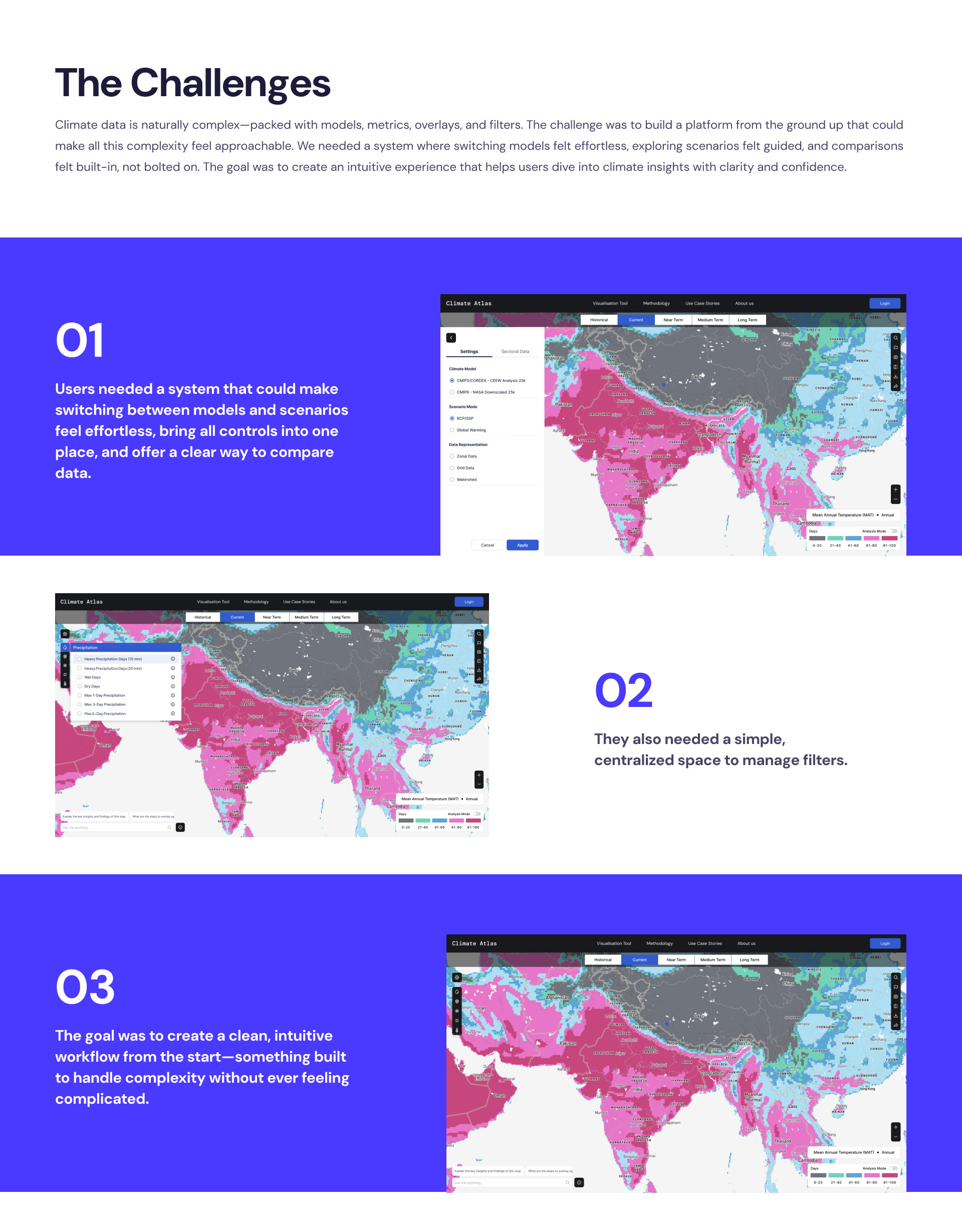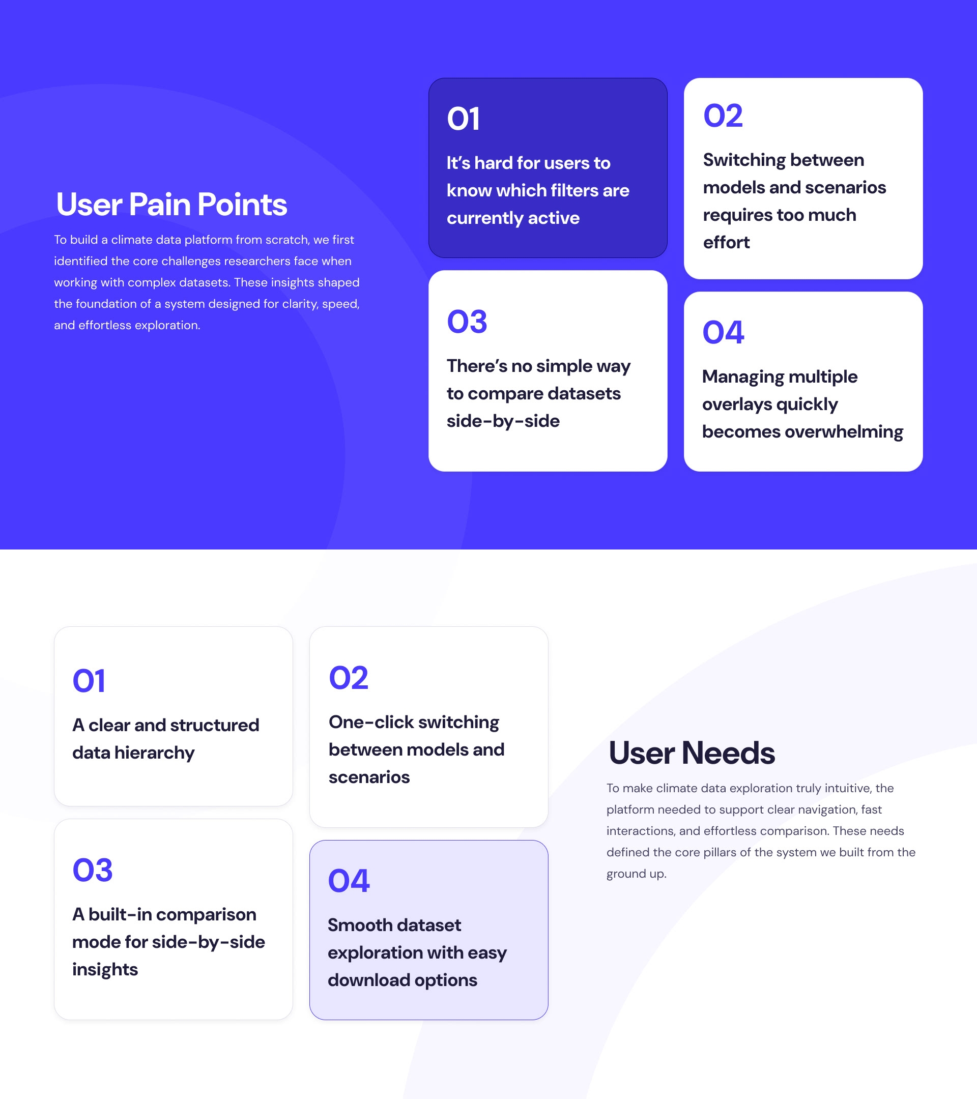 A complex climate dataset needed a home that felt simple, intuitive, and easy to explore. As the UI/UX Designer, I worked across IA, user flows, and dashboard UI to transform heavy scientific information into a clear, unified experience for researchers and policymakers.