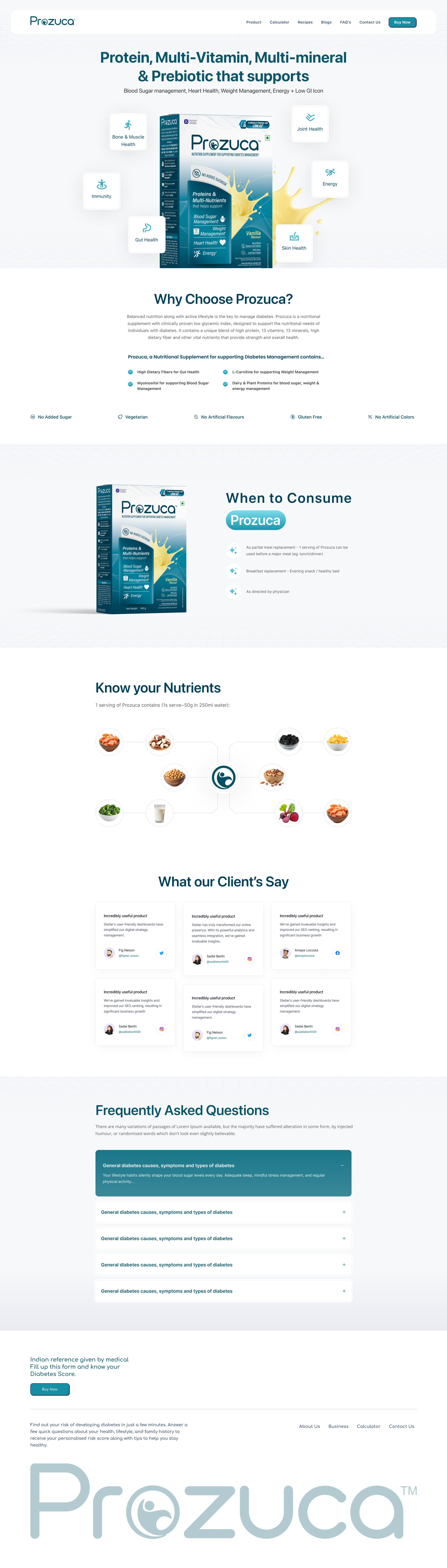 For the Prozuca product launch, I created a dedicated product showcase page that communicates the key features, usage benefits, and scientific value of the product. The design emphasizes clarity, quick readability, and structured storytelling — making it easy for users to understand what the product does and why it matters. The page uses clean visuals, focused content blocks, and a modern layout to deliver a professional, trustworthy product experience.